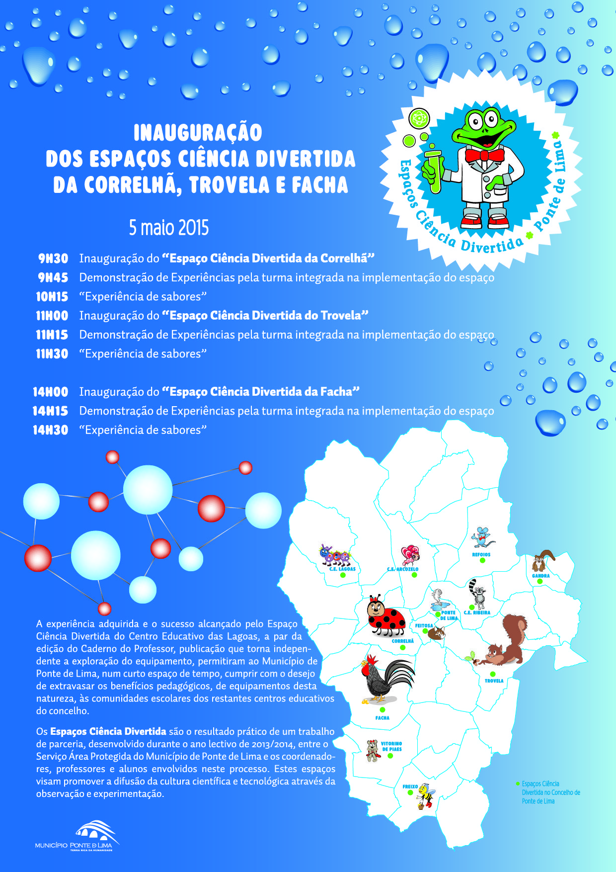 Com a inauguração dos três últimos espaços, na EB1/JI da Correlhã (09h30) e nos Centros Educativos do Trovela (11h00) e da Facha (14h00), o Município encerra o processo de instalação de um Espaço “Ciência Divertida” em cada Centro Educativo do Concelho.