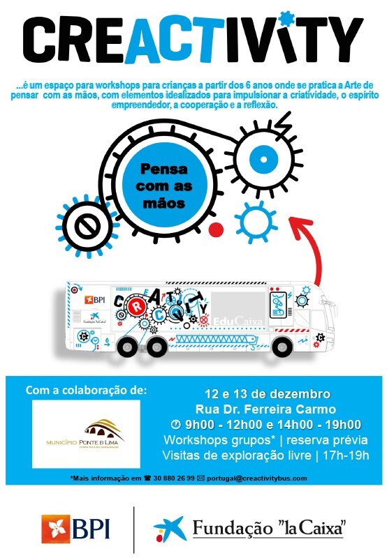 O Município de Ponte de Lima acolhe o espaço itinerante “Creactivity” nos próximos dias 12 e 13 de dezembro. Trata-se de um projeto pedagógico que poderá ser visitado por grupos escolares do ensino básico e secundário, de forma gratuita.