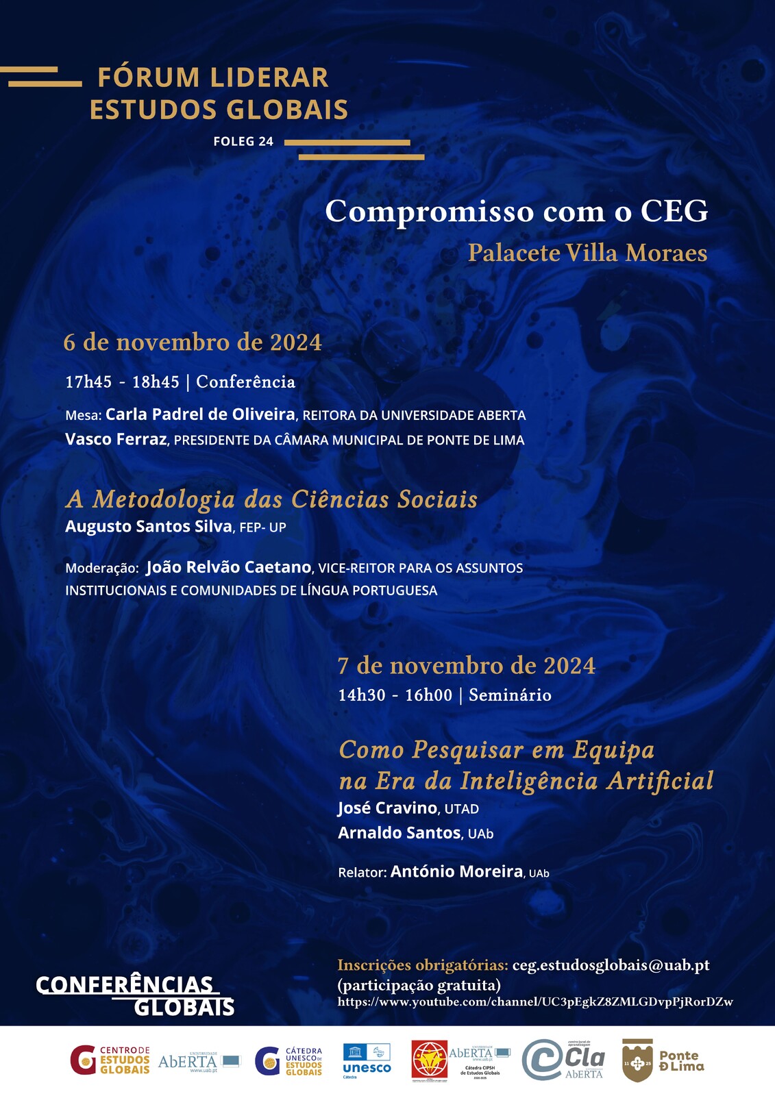 No dia seguinte, a 7 de novembro, às 14h30, acontece o Seminário: Como Pesquisar em Equipa na Era da Inteligência Artificial, com José Cravino (UTAD) e Arnaldo Santos (UAb), sendo moderado pelo Vice-Reiro para a Interação com a Sociedade e Coordenador Geral da Unidade de Desenvolvimento dos CLA, Domingos Caeiro.