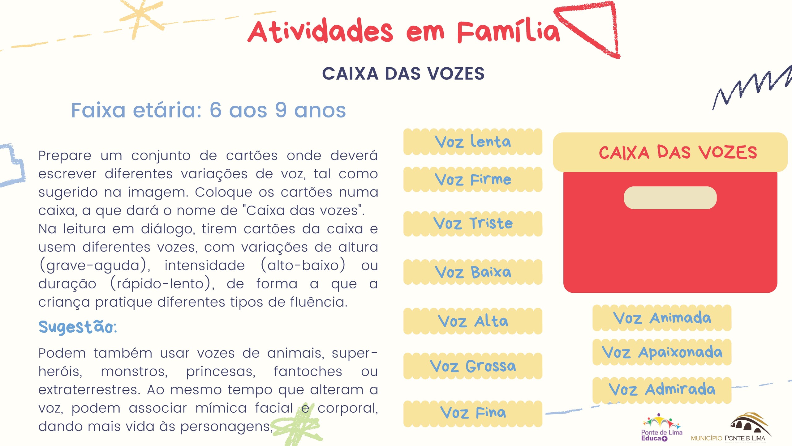 O jogo “Caixa das Vozes” poderá ser bastante útil para fazer em casa com os seus educandos. De uma forma lúdica, a criança ganhará competências para a leitura: diferentes vozes, com variações de altura, intensidade ou duração.